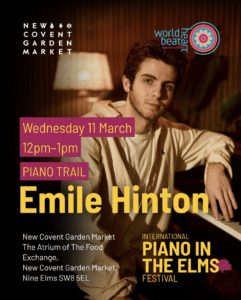 New Covent Garden Market becomes the centre of an international piano festival next Wednesday (March 11th) as award-winning jazz pianist Emile Hinton plays from midday to 1pm in the Atrium of The Food Exchange.